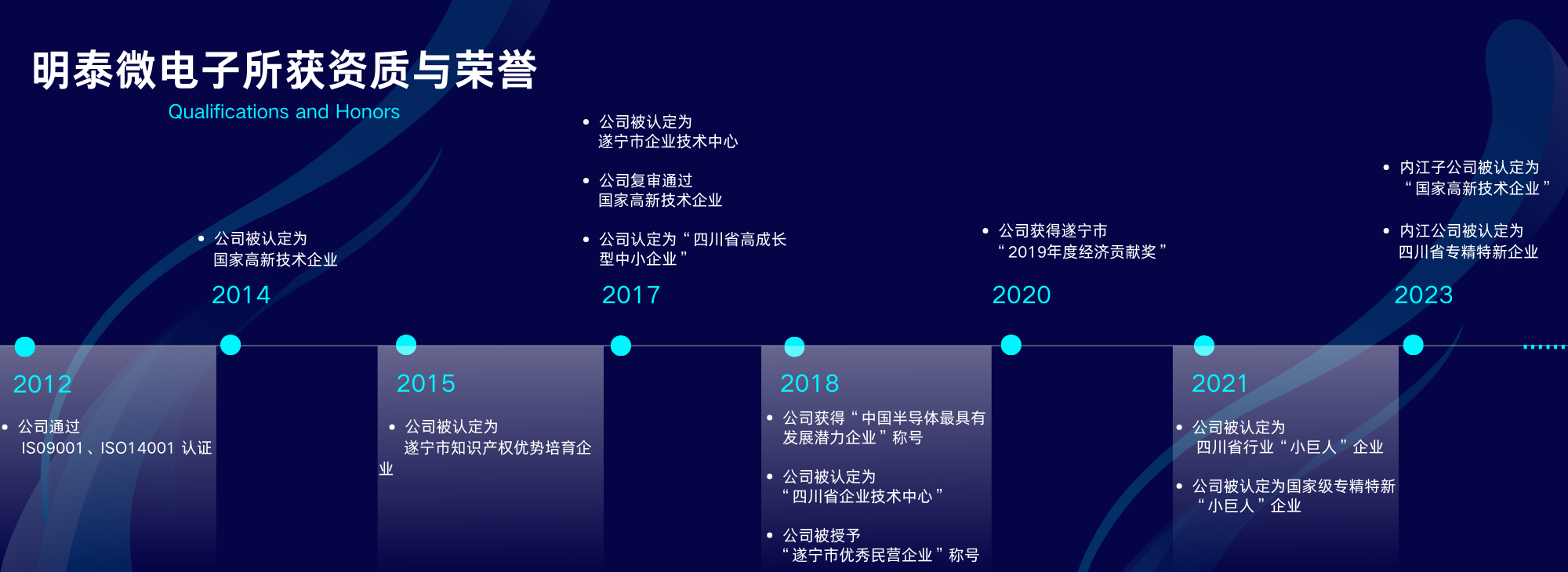 四川明泰電子科技有限公司獲得的資質(zhì)和榮譽(yù) ?2012年,公司通過(guò)ISO9001和ISO14001認(rèn)證; 2014年,公司認(rèn)定為“國(guó)家高新技術(shù)企業(yè)”; 2015年,公司認(rèn)定為“遂寧市知識(shí)產(chǎn)權(quán)優(yōu)勢(shì)培育企業(yè)”;
